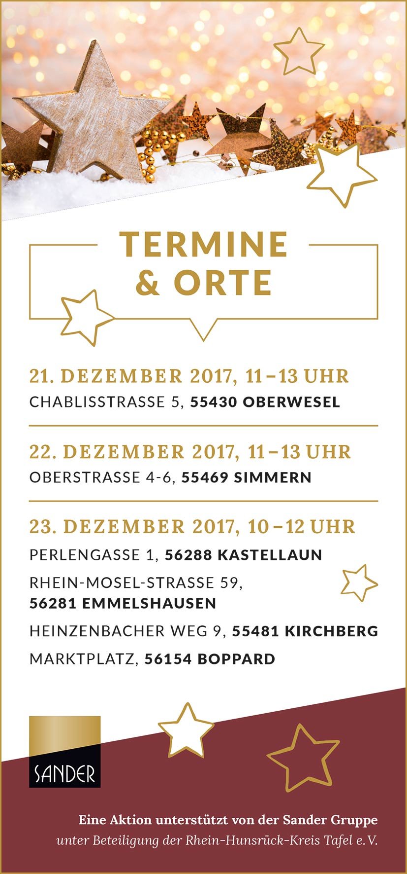 Unentgeltlich zur Verfügung gestellt werden die Mahlzeiten von der Sander Gruppe mit Sitz in Wiebelsheim. „Als Familienunternehmen ist uns soziales Bewusstsein besonders wichtig“, sagt Geschäftsführer Jens Sander. „Deshalb unterstützen wir die Menschen in unserer Region.“ Ludwig Geissbauer, Vorsitzender des Vereins Rhein-Hunsrück-Tafel e.V. begrüßt das Engagement: „Diese Geste bedeutet uns viel. Wir freuen uns, dass die Familie Sander den Tafel-Besuchern im Rhein-Hunsrück-Kreis mit ihrer Spende eine schöne Weihnachtseinstimmung ermöglicht.“