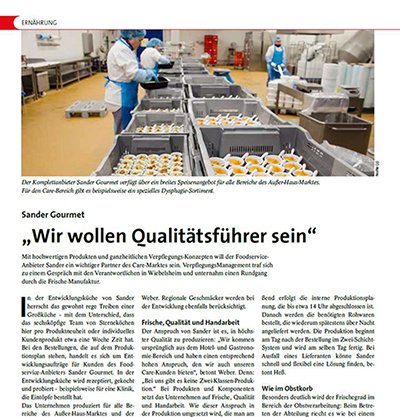 Mit hochwertigen Produkten und ganzheitlichen Verpflegungs-Konzepten will der Foodservice-Anbieter Sander ein wichtiger Partner des Care-Marktes sein. VerpflegungsManagement traf sich zu einem Gespräch mit den Verantwortlichen in Wiebelsheim und unternahm einen Rundgang durch die Frische-Manufaktur.